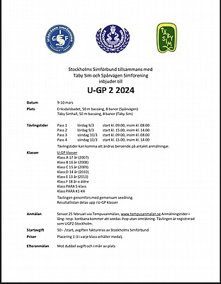 Hej! Här kommer inbjudan till UGP 2, det är 50m bana och 4 pass som vanligt. Jätte kul om någon vill vara med! Om ni vill skickar ni vilka grenar/simsätt ni vill simma till mig (Lina) på sms. Telefonnummer finns både i sport admin och här på gruppsidan!